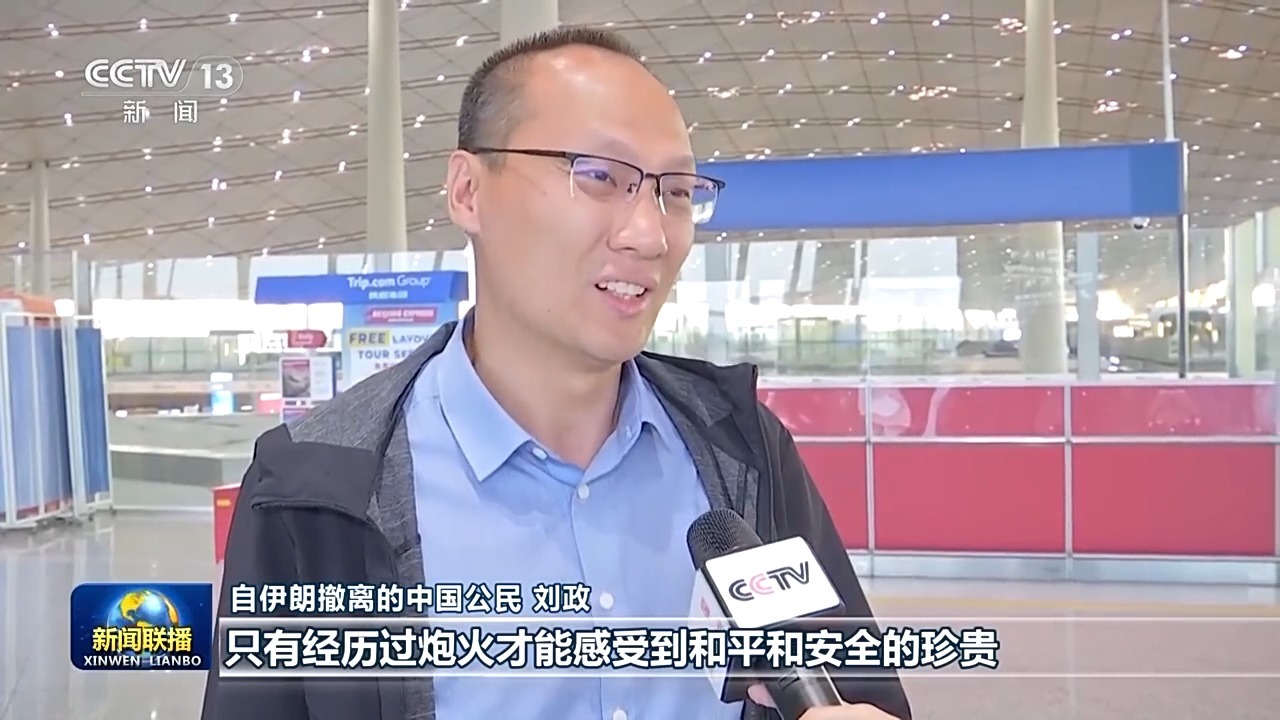 自伊朗撤离的中国公民 刘政:在过境的时候和登飞机时候,我都看到有人哭了。再次回到祖国的怀抱,感受到祖国的温暖,只有经历过炮火才能感受到和平和安全的珍贵。